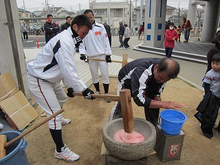 2月6日、松山市・三津浜公民館で行われた「新年子ども餅つき大会」に大堂選手、藤長選手が参加しました。