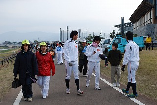 3選手は、屋内運動場での出発式で自己紹介の後、参加者と一緒に準備体操をし、冷たい風が吹く屋外へ、元気に出発。歩いている途中、サインを求められたり、堀江体育協会軟式野球部の児童の皆さんと談笑したりしながら、心地よい汗を流しました。