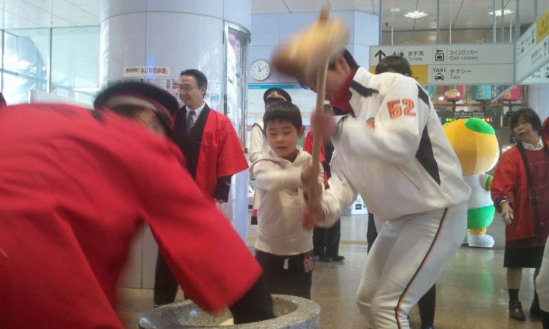 四ツ谷選手も後藤選手ももちつきイベント経験者です!豪快におもちつき!