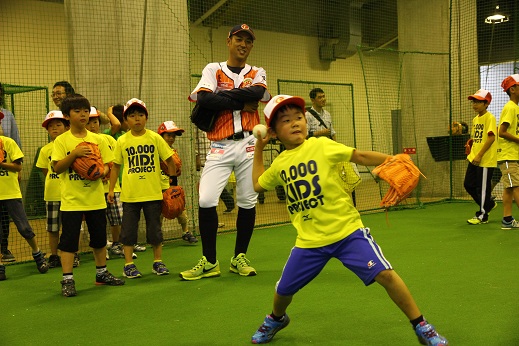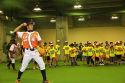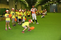 あいにくの雨で試合前セレモニーに参加することはできませんでしたが、作ったグローブで早速野球教室を行いました!