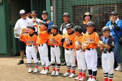 始球式は山田井スポーツ少年団の選手。ナイスピッチング! 投球後は河原監督や白根コーチ、選手とハイタッチ。夏休みのいい思い出になったことでしょう。