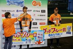 ▲六回、タイムリーツーベースを放ちガッツポーズの福田。グッドプレー賞には平松航、福田融司のバッテリーが受賞