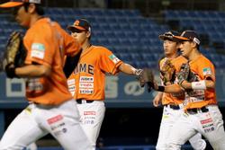 ▲9回を投げ切り、野手陣からねぎらわれる菅原(左から2人目)