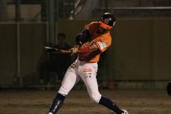 ▲二回、レフト前にヒットを放つ福山智己。福山はこの試合3打数2安打