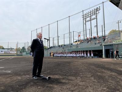 ▲新居浜市長石川勝行さまより、激励のご挨拶。始球式も務めて頂きました。