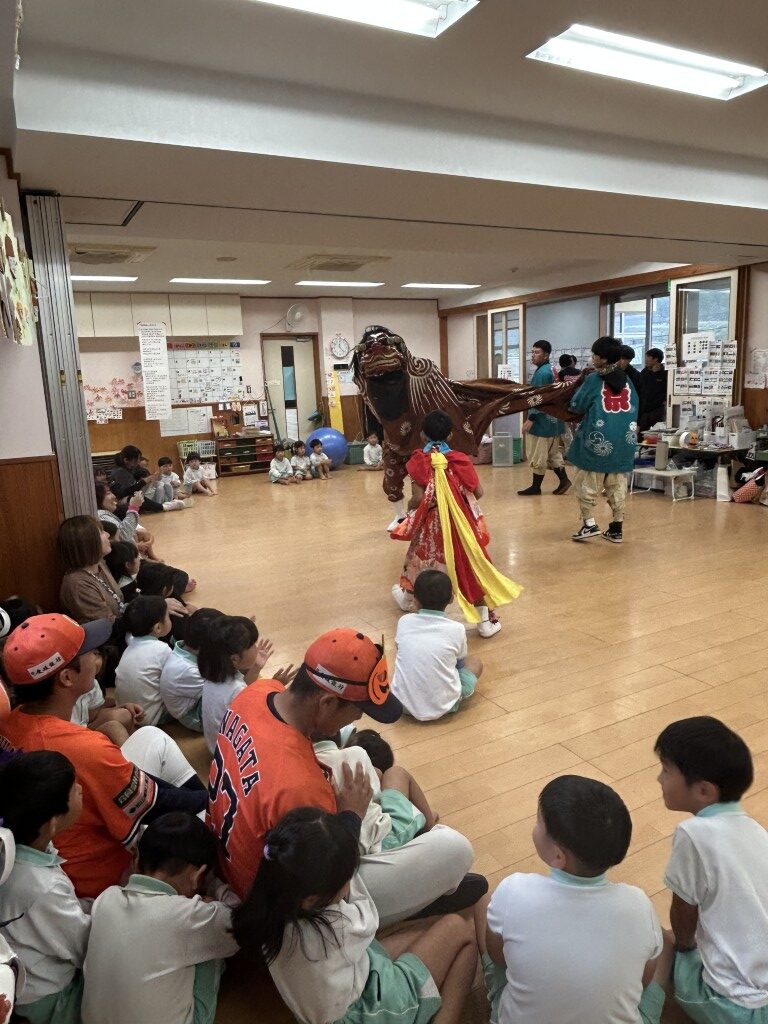 そして…園には”獅子舞”が登場、笑顔が一瞬で泣き顔に!? 選手の背中に隠れる姿がかわいすぎました。