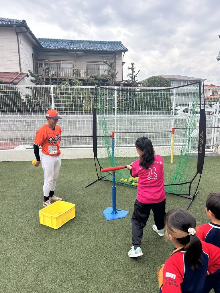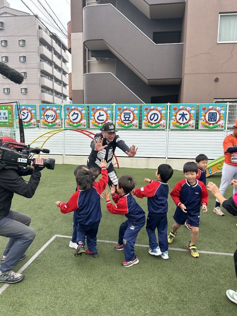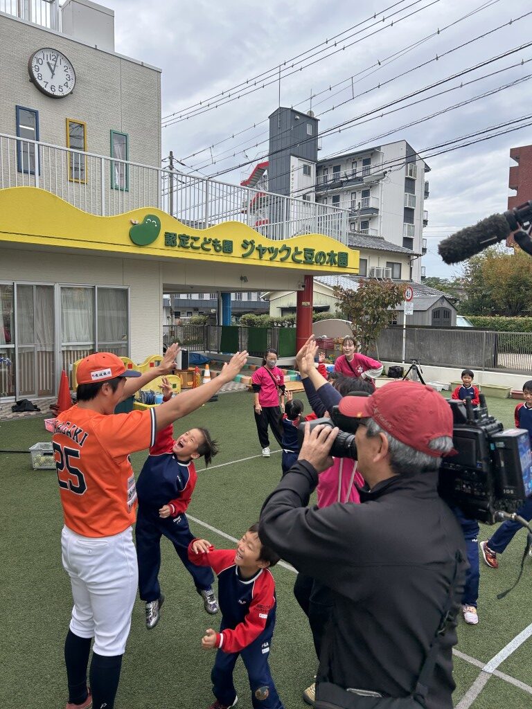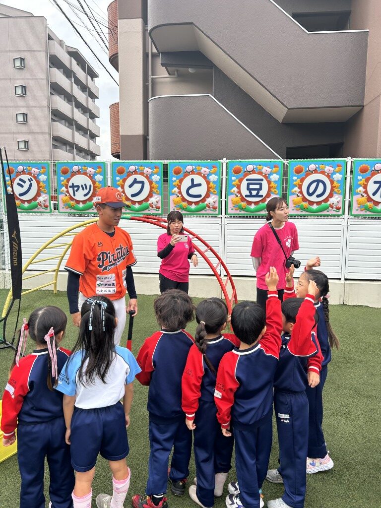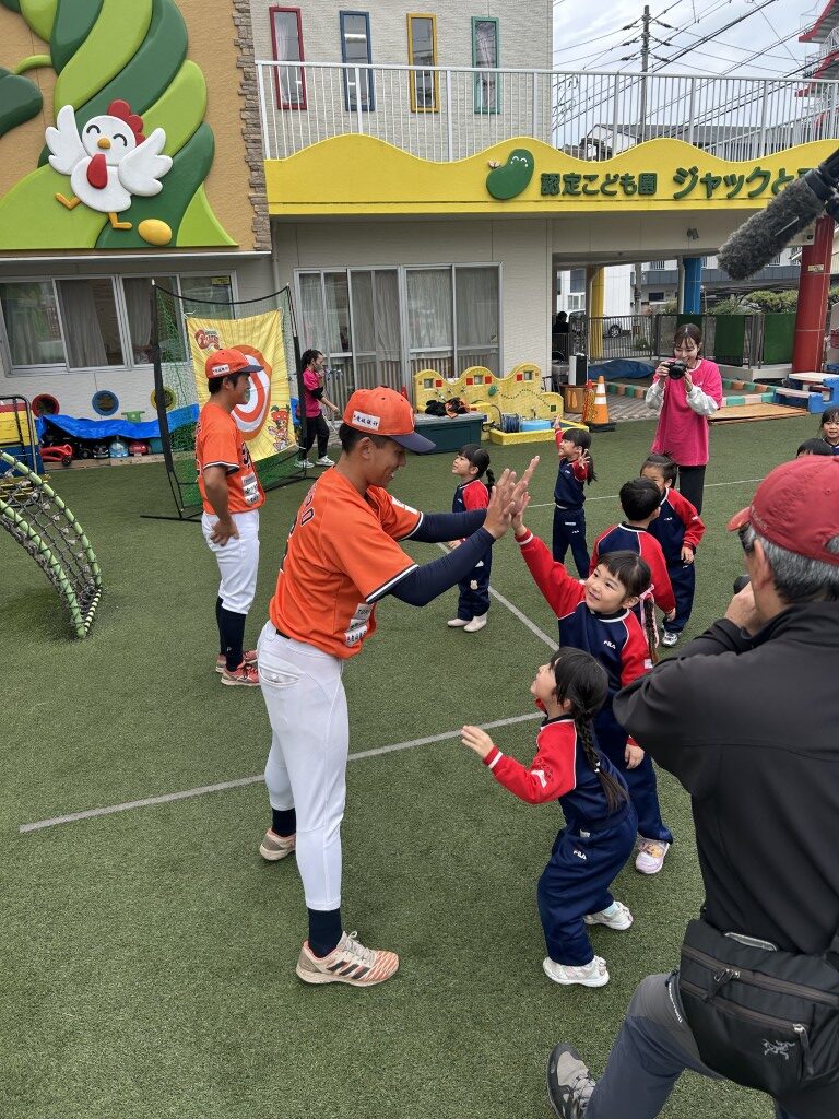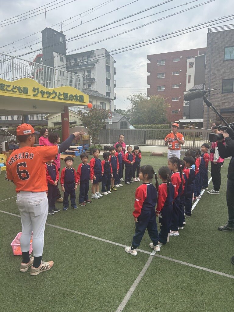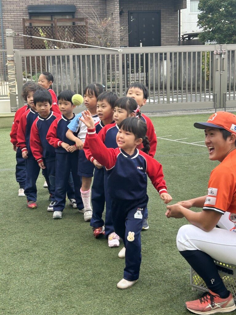 心配していた雨も止み、園庭で元気いっぱいの野球体験を実施。いつもの準備運動から笑顔でスタート!背の高い選手にジャンプしてハイタッチする園児たちの姿がとっても可愛かったです。