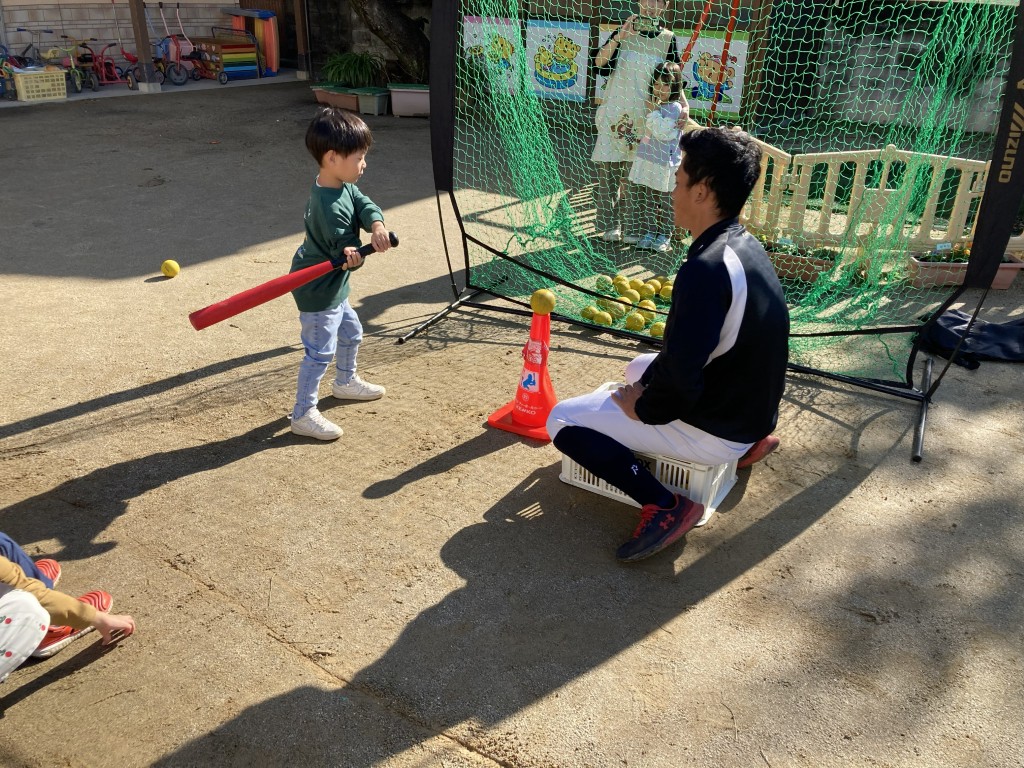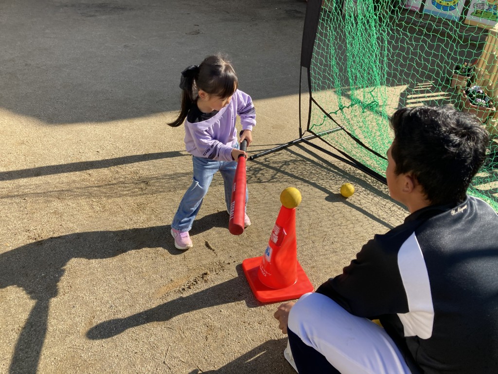 野球体験では、バットを思いきり振ったり、ボールを勢いよく投げたり、みんな全力チャレンジでキラキラ笑顔が止まらない!