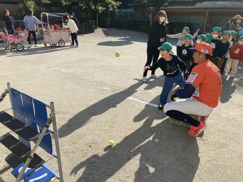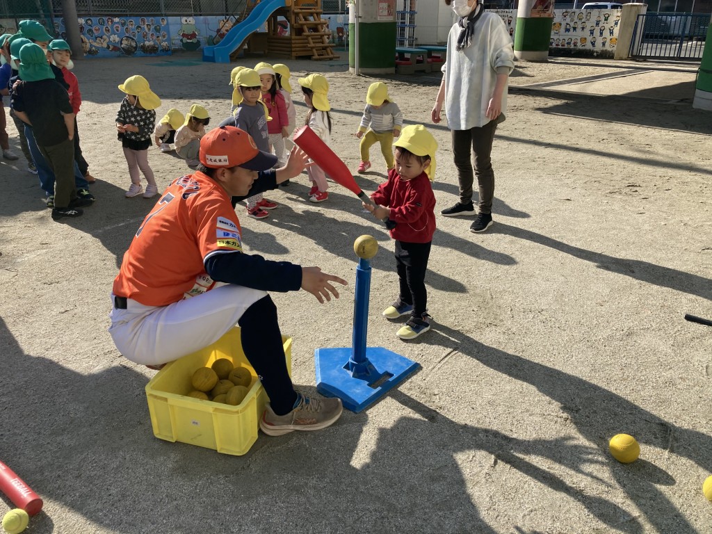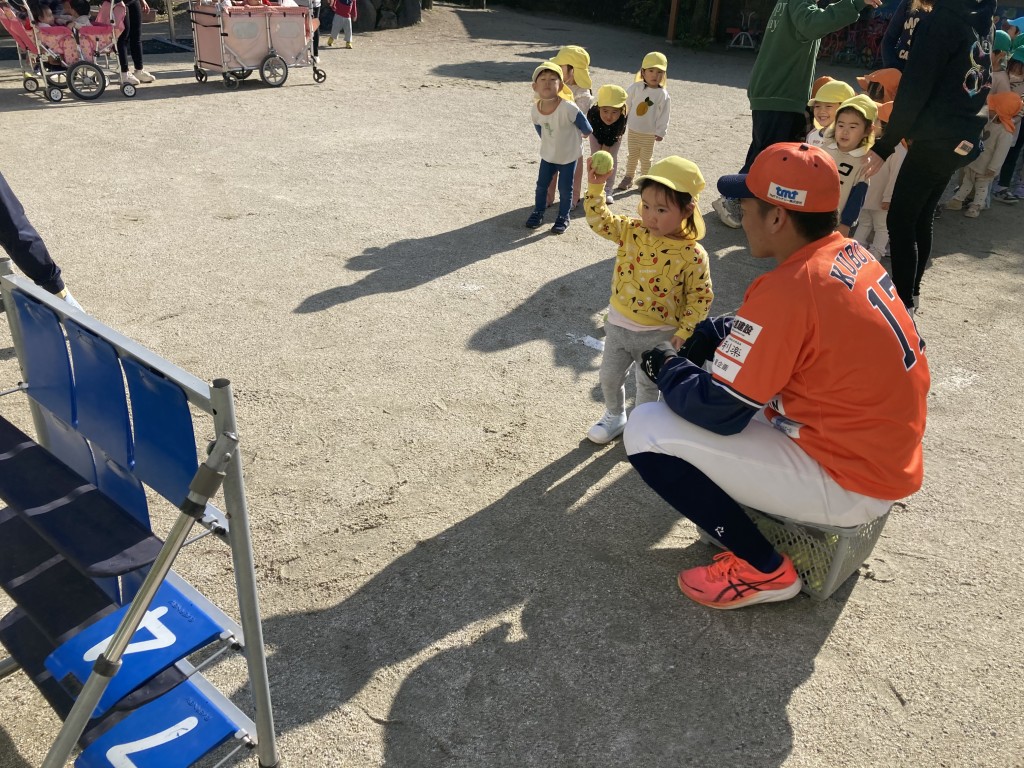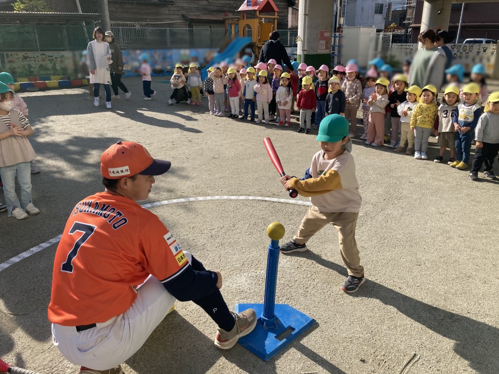 快晴の中、元気いっぱいに野球体験スタート!年長さんはもちろん、見学していたお友達も一緒にチャレンジ。