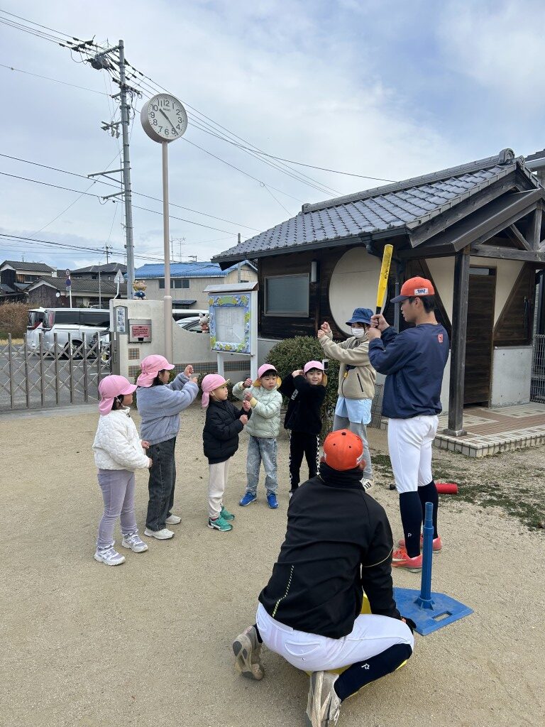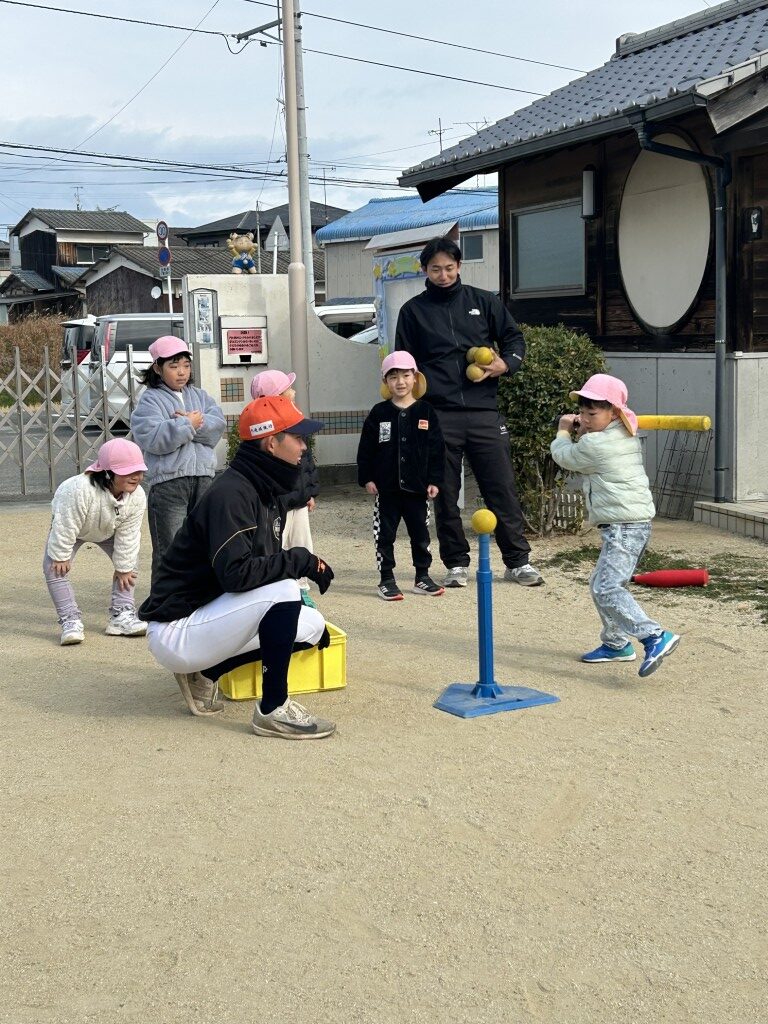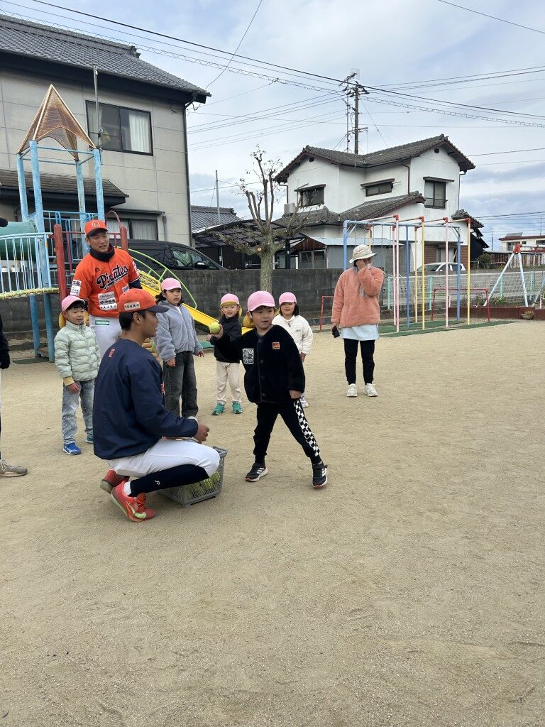 今回は菊間保育所 も合同で実施。計5名の元気いっぱいの園児たちと野球体験スタート。