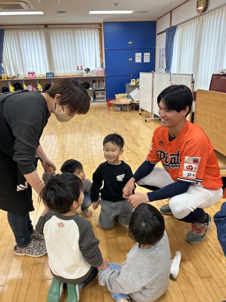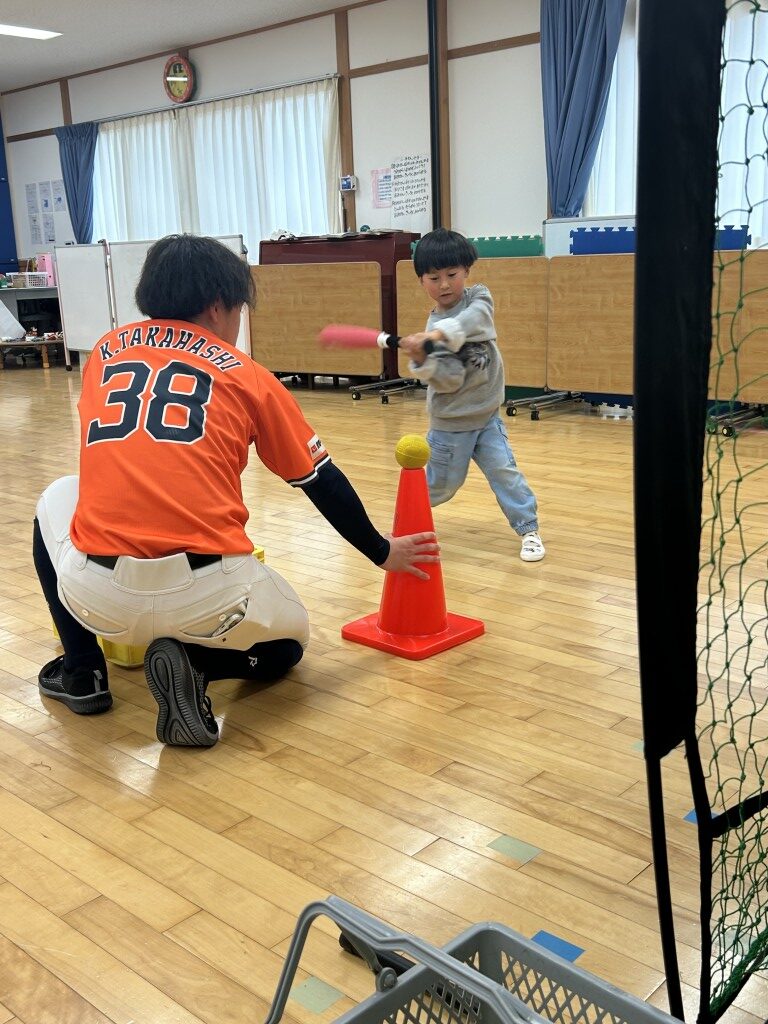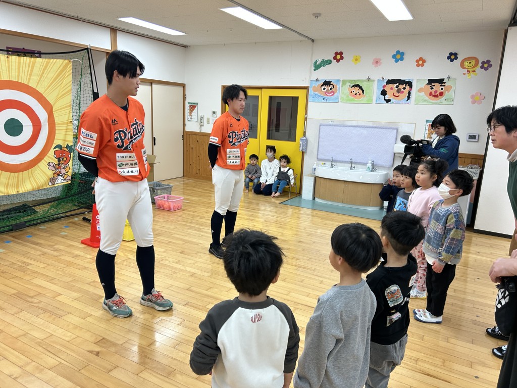 最後に、浅田組様 より 「愛媛マンダリンパイレーツ×浅田組」 幼児用スターターセット(ケンコーティーボール)を贈呈。新しい道具で、これからもたくさん野球を楽しんでくださいね。