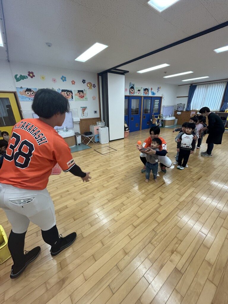 全園児9名の元気いっぱいなみんなと野球体験スタート。