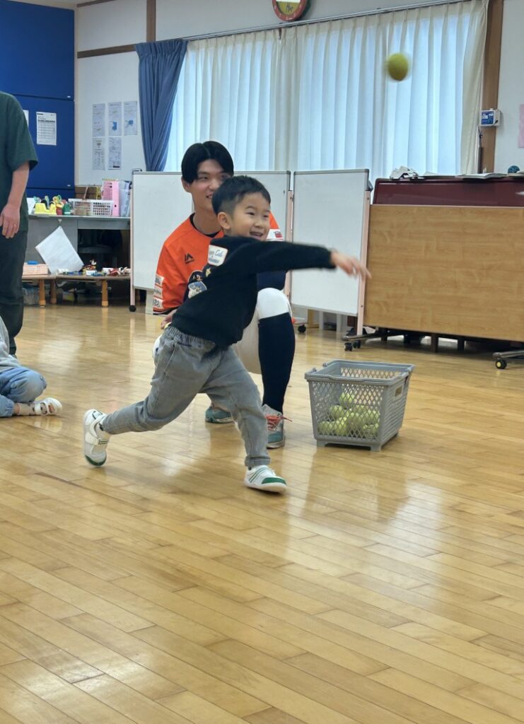 選手の後に、園児のみなさんも立派に自己紹介、名前で呼び合い親近感アップ